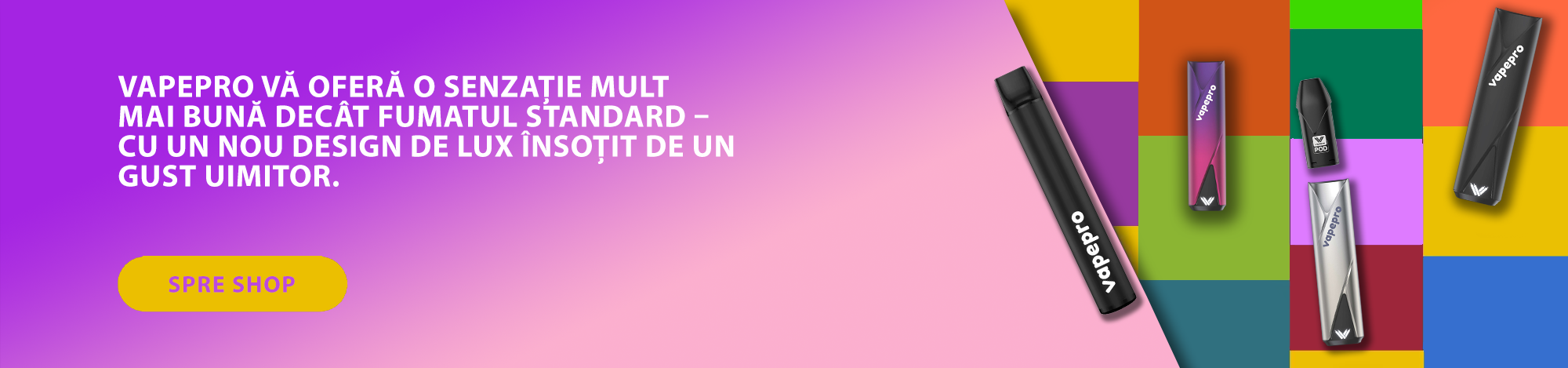 Vapepro este un brand inovator axat pe crearea celor mai bune soluții pentru piața noilor produse de vaping. Misiunea noastră este de a crea o experiență unică pentru consumator, oferind consumatorilor atât produse de vaporizare cu nicotină, cât și fără nicotină, în aromele lor preferate și satisfacând toate nevoile lor de vapoare.